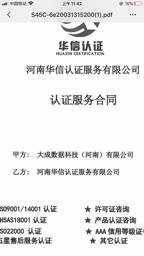 恭喜大成数据科技(河南)有限公司和华信认证签定认证服务合同