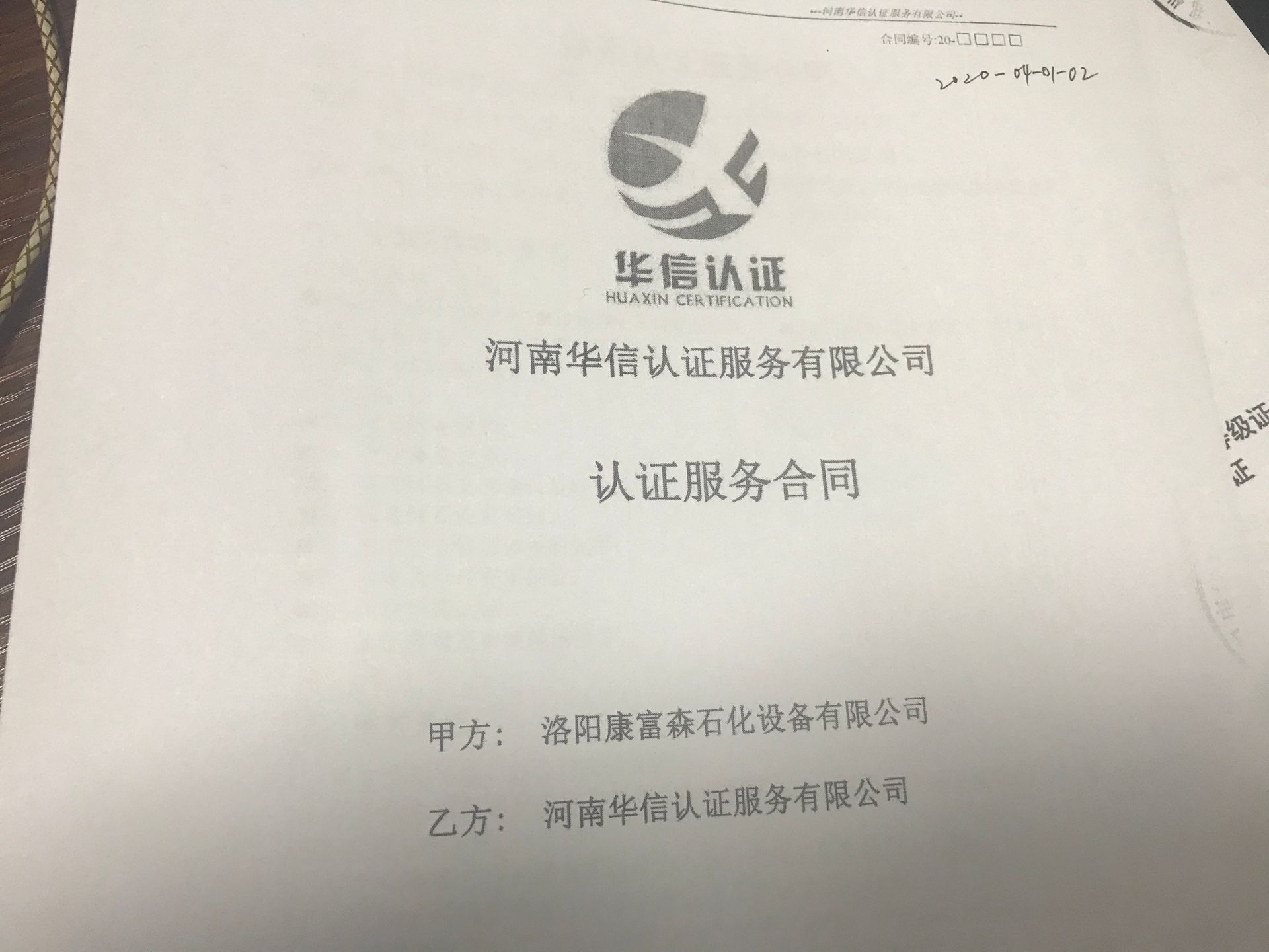 恭祝洛阳康复森石化有限公司与华信认证签定认证服务合同
