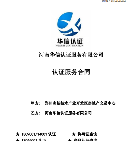 祝贺郑州高新技术产业开发区房地产交易中心与华信认证签定认证服务合同