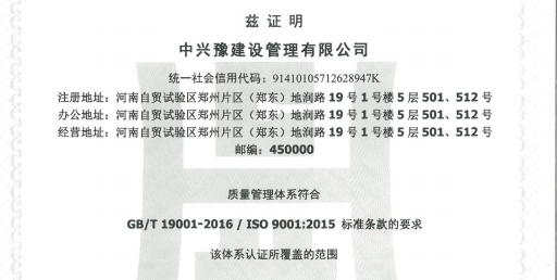 恭祝中兴豫建设管理有限公司获得华信认证的三体系认证证书!