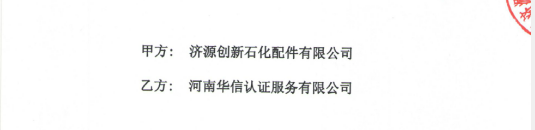 祝济源创新石化配件有限公司与华信签定认证服务合同!