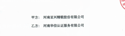 祝河南亚兴精锻股份有限公司与华信签定认证服务合同!