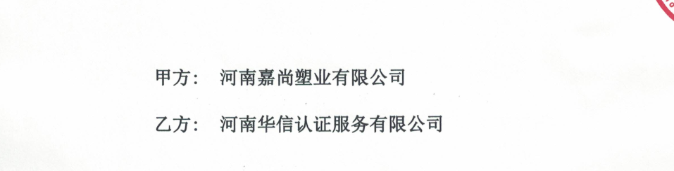 祝河南嘉尚塑业有限公司与华信签定认证服务合同!