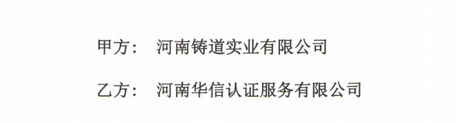 祝河南铸道实业有限公司与华信签定认证服务合同!